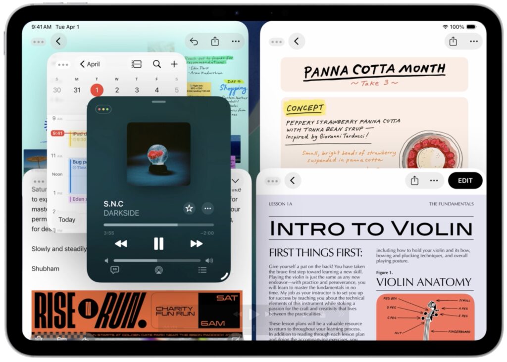 - Window management: Every app can now be transformed into a standalone window that you can move and resize freely. Windows remember their size and position, and you can tile them flexibly, with options to split the screen into two, three, or four sections. The familiar traffic light window controls from the Mac reappear along with the macOS Move & Resize and Fill & Arrange options. Swiping up invokes Exposé, allowing you to view all windows and switch to your desired one easily.