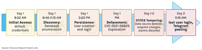 In the compromise aimed at the decoy plant, the threat actor is said to have moved from initial access to disruptive action in about 26 hours, using default credentials to obtain initial access, followed by carrying out reconnaissance and persistence activities by creating a new user account named “BARLATI.”