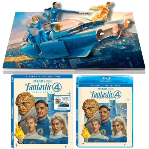 As usual for Marvel movies, Walmart has an exclusive 1080p Blu-ray edition of First Steps with pop-up art. The slipcover unfolds to create a 3D display of the superhero team in the FantastiCar.