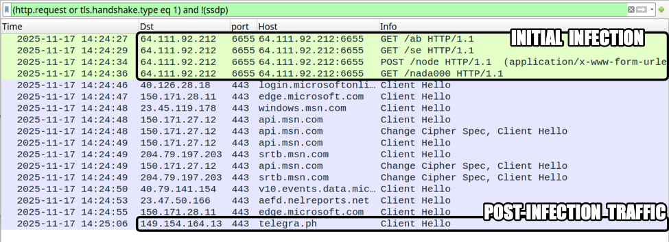 Shown above: Traffic from the infection, filtered in Wireshark.