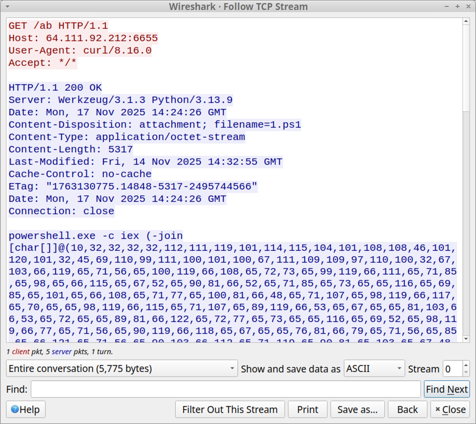 I tried this on a vulnerable Windows client in an Active Directory (AD) environment, and it ran PowerShell script that retrieved a zip archive containing a malicious Python script, as well as the Windows Python environment to run it.