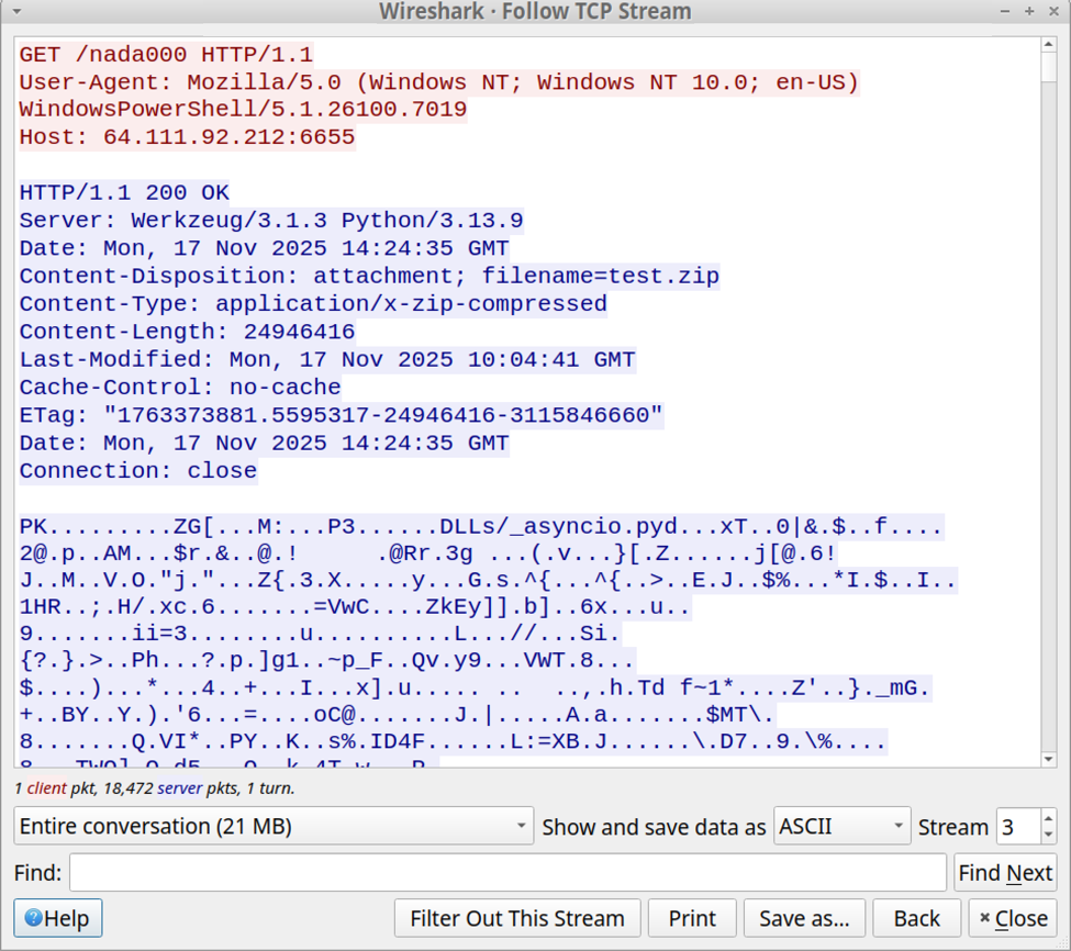 Shown above: Final HTTP request from the initial infection traffic returned a zip archive containing a Python environment and a malicious Python script.