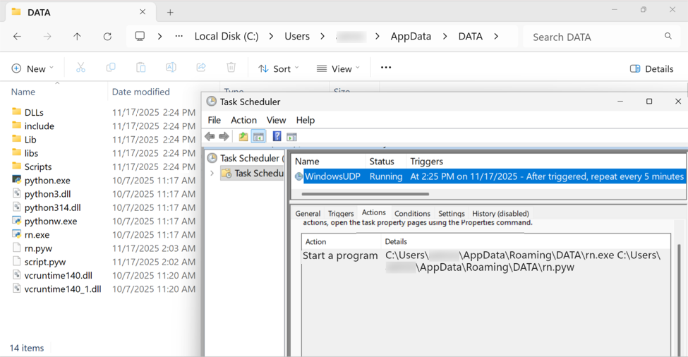 The malicious Python package was saved to the Windows client under the user account’s AppData\Roaming directory under a folder named DATA. A scheduled task kept the infection persistent.
